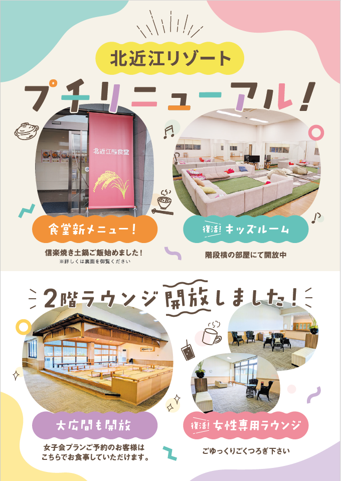 イベントとお知らせとブログ イベント お知らせ ブログ お知らせ 2025.10.30 プチリニューアル お知らせ 2025.11.02 【ご案内】 お知らせ 2025.12.01 【お知らせ】平日限定!1000円定食・第2弾販売! お知らせ 2025.11.30 [2025年12月]北近江リゾート休館日のご案内 お知らせ 2025.11.22 【2025年】パン工房Tim シュトレン販売! お知らせ 2025.11.09 【お知らせ②】平日限定!温泉&食堂お得セット販売!