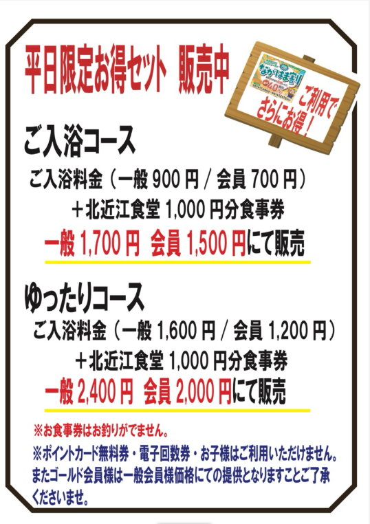 温泉フロントにて、通常の入浴料から200円引き+北近江食堂1000円お食事券のセットを販売致します!