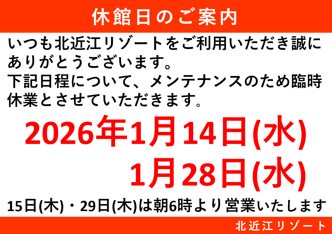 イベントとお知らせとブログ イベント お知らせ ブログ お知らせ 2025.12.27 1月休館日 お知らせ 2025.11.02 【ご案内】 お知らせ 2026.01.09 【お知らせ】 お知らせ 2025.12.27 [2026年1月]北近江リゾート休館日のご案内 お知らせ 2025.12.20 【2025年】クリスマスイベント開催! お知らせ 2025.12.11 【2025年12月】休館日変更のお知らせ