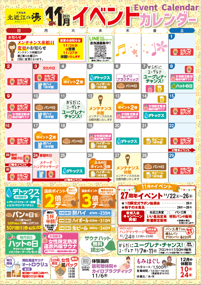女性限定イベントは土日祝日の泥パックや、デトックスデーのはちみつを肌につけてのミストサウナ体験などがあります。