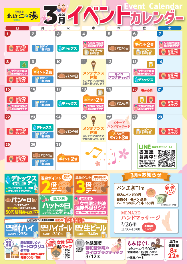 女性限定イベントは土日祝日の泥パックや、デトックスデーのはちみつを肌につけてのミストサウナ体験などがあります。